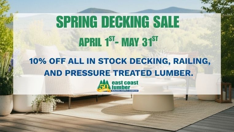 Whether you’re building a simple front entrance or an elaborate backyard paradise, East Coast Lumber can help you create the perfect deck for your home. We carry a large selection of decking and railing systems including composite, cellular PVC, mahogany, red cedar, pressure treated, and more. When you’re ready to build your dream deck, visit our contractor sales and estimating department. We are happy to assist you by providing a complimentary design and material list for your new deck, big or small.